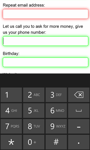If you use a lot Chrome or Safari you might be familiar with the little widget on the far right of the “Donation” field. As I was writing my example and testing I quite liked the functionality of it. When testing on IE10 and later checking the spec I realized that this is an extra that Chrome adds. HTML5 adds instead two new methods of the “input” element named stepUp and stepDown and the developer is left with the burden to implement it, but also the freedom of designing it as he wishes. Either way all browsers evaluate the value correctly. Since I define a “min” and a “step”, the value will be considered invalid until the user enters a multiple of 10. If you test on your Windows Phone 8 device you will see that the surrounding color will change from red to green if you enter for example the number 20. Look at the source code to see the CSS pseudo-classes. This is the markup I used to define the input field: